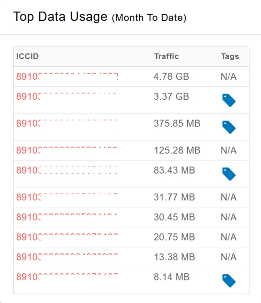 This is a top 10 SIM list in descending order of month-to-date data consumption. This allows users to click on a SIM and directly look into the details of a profile.